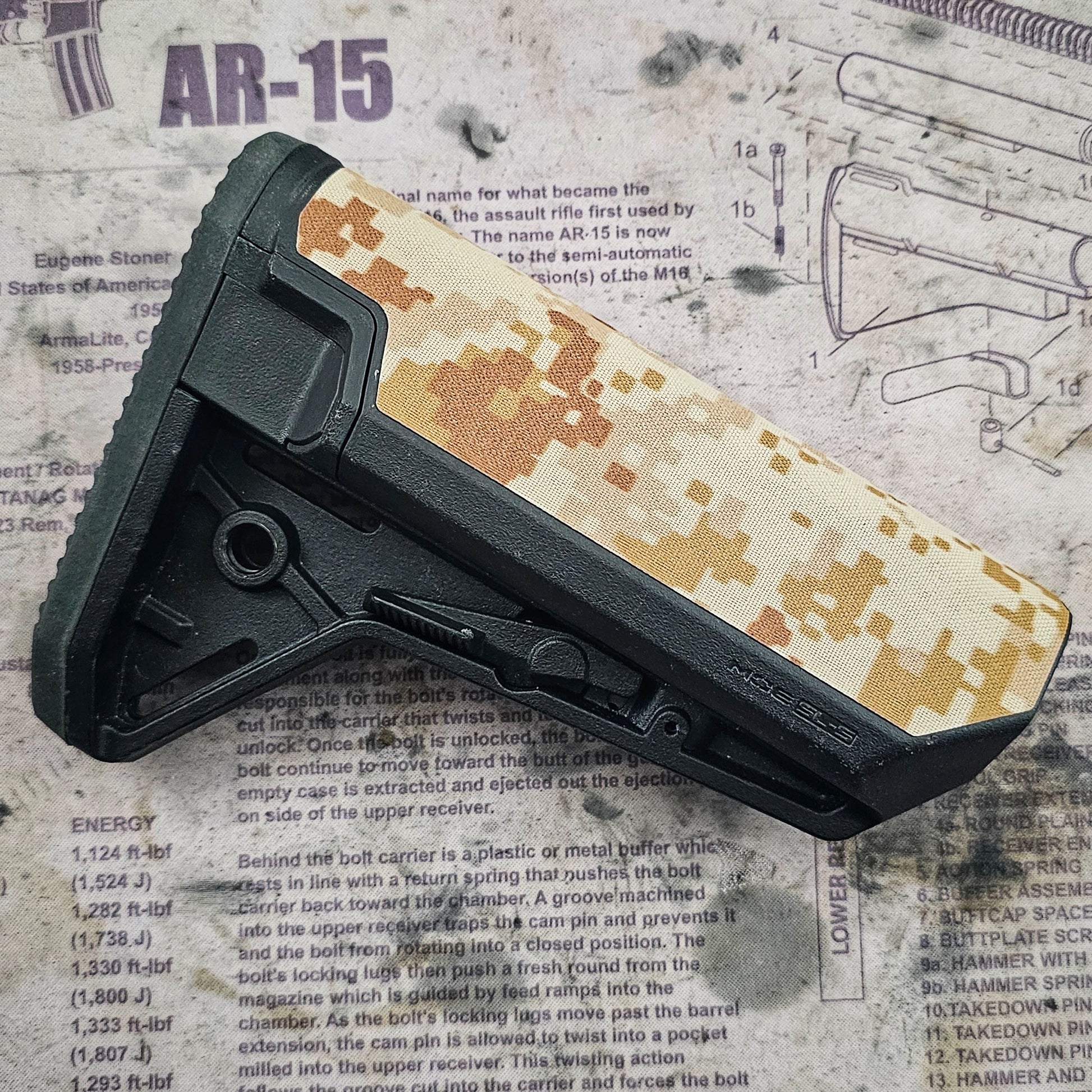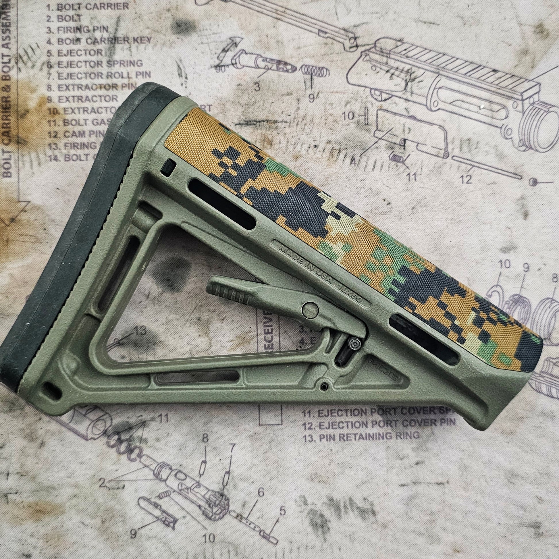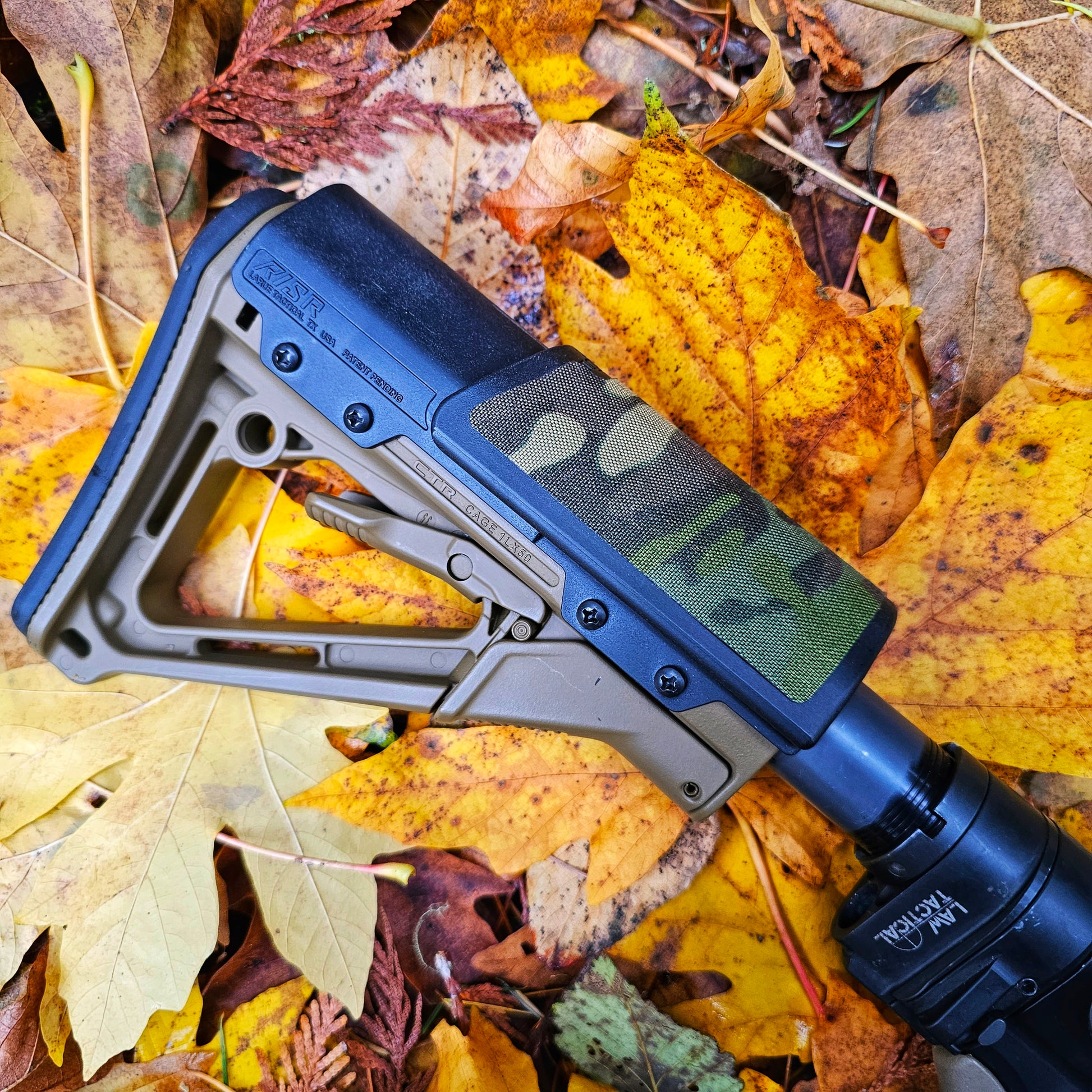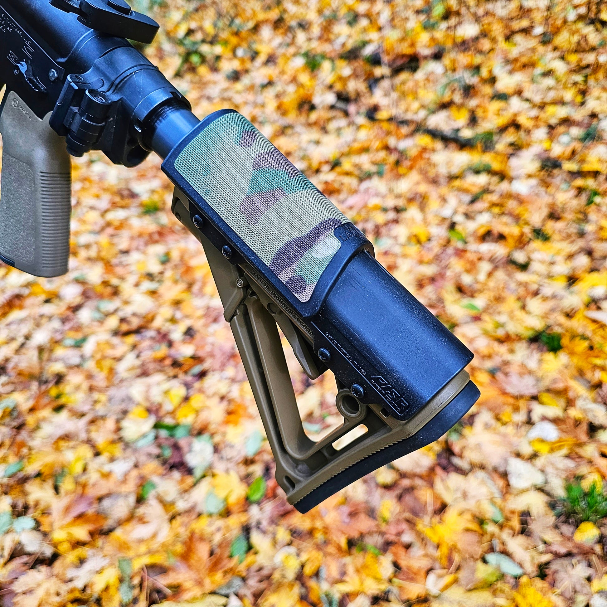 These are both stylish, and high quality. The cheek rests are made from 500D Cordura for maximum durability. Being both water and UV resistant, these are made to last. We laminate the Cordura fabric of your choice to a layer of high strength 3M adhesive to hold it in place. From there, we laser cut them to fit perfectly.